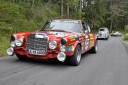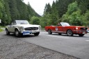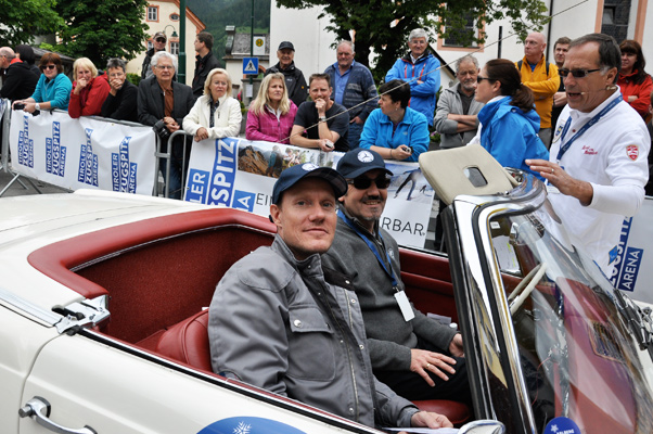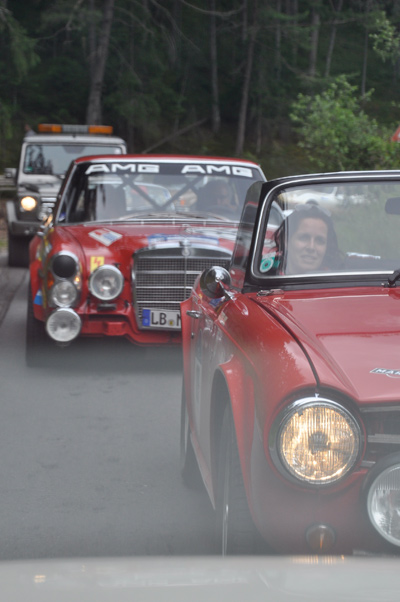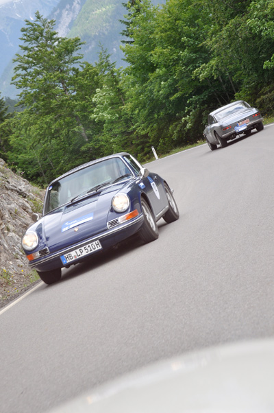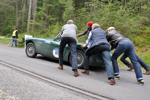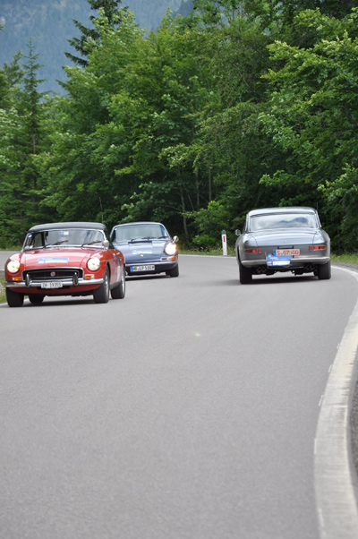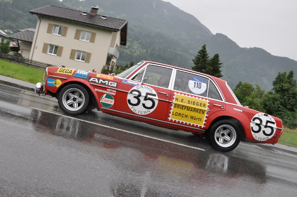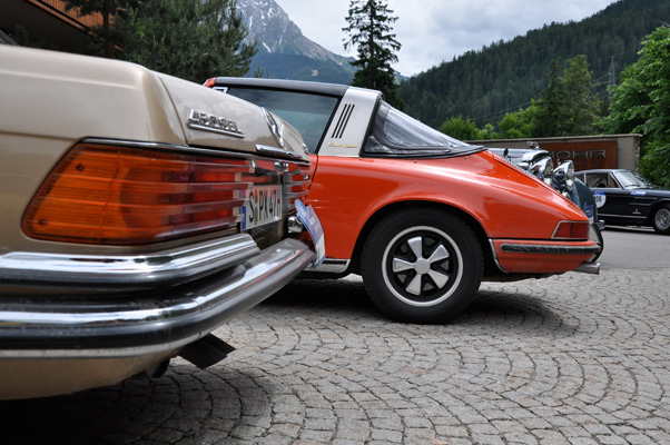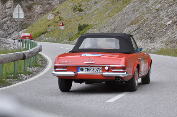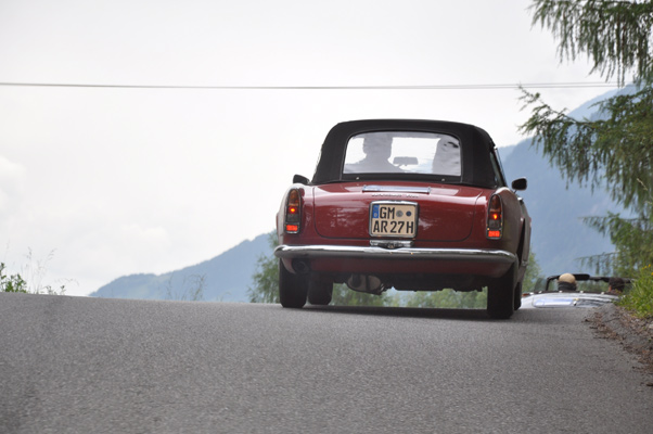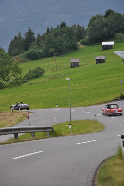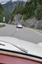 Um 8:00h grollen die startenden Fahrzeuge durch das noch verschlafene Lech. Wir haben noch etwas Aufschub und können in Ruhe Frühstücken. Die hohe Startnummer hat auch Positives. Um 9:34h gehen wir auf die 250km lange Strecke. Zunächst durch das Lechtal, aufs 1894m hohe Hahntennjoch, dann durchs Pitz- und Ötztal. Über den Fernpass nach Leermoos zum Mittagsstopp. Zuschauer sind nicht so viele an der Strecke, aber als gegen 12 die Schule aus ist, kommen die Kinder in Scharen. An einer Stempelkontrolle holen sie sich von allen Teams Autogramme in ihr Programmheft. Fast vergessen wir unseren Stempel in der Bordkarte. Die Wertungsprüfungen laufen nicht ganz optimal, dafür ist aber unerwartet schönes Wetter unser Begleiter geworden. Am Nachmittag wagen wir sogar, das Dach zu öffnen und lernen unsere Pagode jetzt akustisch noch mehr zu schätzen. Sie kann flott bewegt werden, den Porsche 356 C Carrera 2 können wir aber nicht abschütteln. Am Nachmittag fahren wir durch das Bergwangertal und das entlegene Hinterhornbach zurück nach Lech. Tagesplatzierung 55. Hmmm…es war auch Luft nach unten.