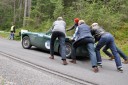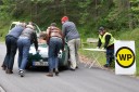 Am Abend hatte ich noch die letzten Änderungen ins Roadbook eingetragen und die Durchschnittsgeschwindigkeiten der Wertungsprüfungen ausgerechnet und notiert. Wir waren also gut gerüstet. Beim Test der Stoppuhren kam dann jedoch ein mittelgroßer Schreck: Kaputt! Zeiger klemmt? Kann doch gar nicht sein! Ahhh. Als wir anhalten, gibt uns ein hilfsbereiter Kollege den Rat, sie mal aufzuziehen. Äehhh…, genau! Die haben ja keine Batterie (wie meine Eieruhren). Dann der zweite Schock: Tank leer! Gerade schaffen wir es noch rechtzeitig Oktansaft für den Tag zu fassen. Das geht ja gut los!