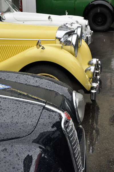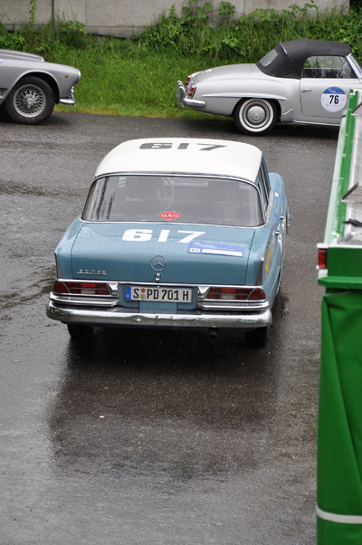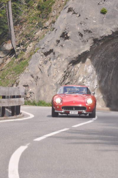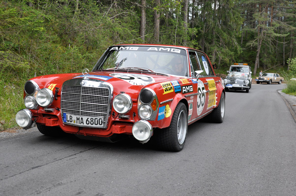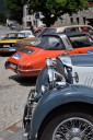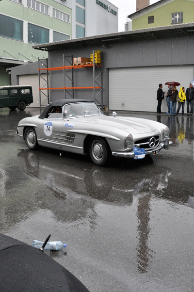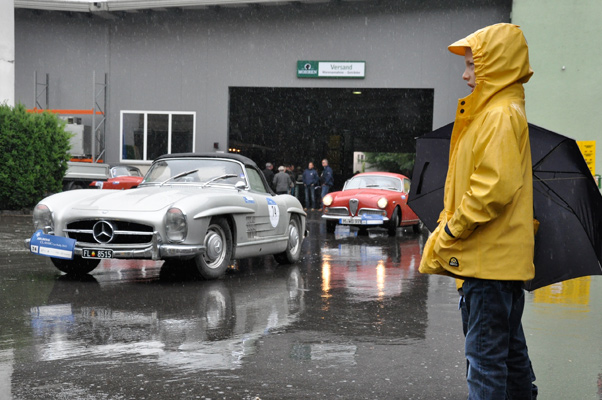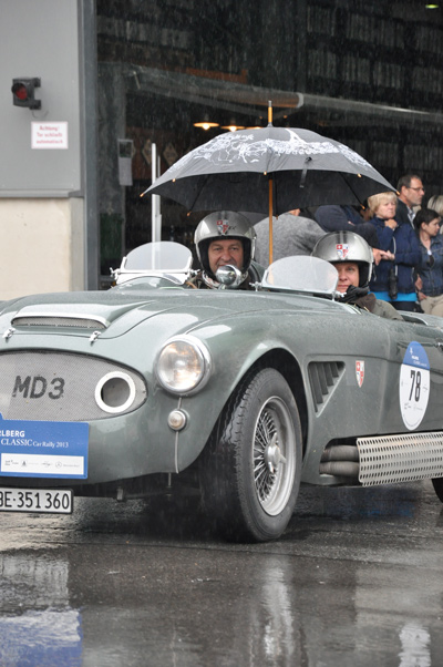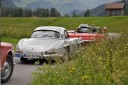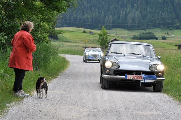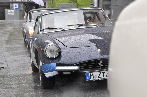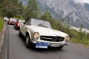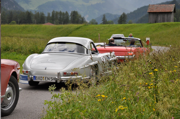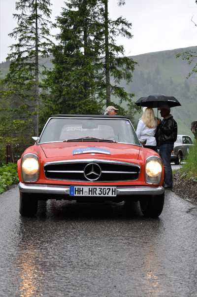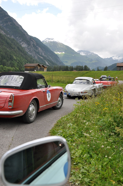 Der Donnerstag verläuft noch gemütlich. Anreise gegen Mittag, dann Begrüßung und Einweisung im extra für die Veranstaltung aufgebauten Glasszelt. Anschließend stellen sich die Teilnehmer zum Start auf. Rallyeleiter und Renn-Ass Armin Schwarz schickt den ersten Wagen, einen Bentley 4 1/2 Liter, um 16:30h auf die Strecke. Die aus über 170 Bewerbungen ausgewählten Fahrzeuge sind wirklich aussergewöhnlich, auch ungewöhnlich ist die große Anzahl an Vorkriegsmodellen, die auf der Strecke gehalten und über die Pässe bewegt werden wollen. Dabei sind einige Mercedes-Benz SSK, der erwähnte Bentley in verschiedenen Ausführungen, Jaguar SS100, Alvis 12/70 Speed 20, Rolls Royce Phantom, Alfa Romeo 8C Monza, 6C 1750 Zagato Spyder und 6C 2500 SS Pinin Farina, Triumpf 2000, Lagonda V12 und LG 6, Invicta 4,5 S, BMW 328 Roadster oder Maybach SW 38 Sport.