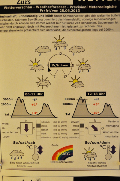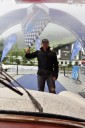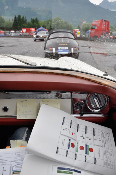 Wir starten heute im 30 Sekundenabstand. Es regnet, ist ziemlich kalt und bin froh ein (Stoff)dach über dem Kopf zu haben. Der Prolog führt uns durch den „Lech Canyon“, ein kurvenreicher, extra gesperrter Streckenabschnitt in Richtung Warth mit tollen Aussichten. Bei den ersten Prüfungen versuchen wir, uns aufeinander einzuschießen. Robert konzentriert sich aufs Fahren, ich aufs Zählen. Klingt einfach, ist es aber nicht. Ist es die Aufregung? Sind es die Kühe, die unvermittelt die Strasse überqueren, ist es die frische Bergluft? Man weiß es nicht. Auch ist in die Fahrt eine „geheime Wertungsprüfung“ eingebaut, die nicht im Roadbook angekündigt wurde. Laut Reglement kann sie jeden Tag auftreten, ist immer 75 m lang und muss in 10 Sekunden gefahren werden. Gut, dass ich mir alles auf Post-It’s an der Handschuhfachklappe notiert habe. Spezialität der Veranstaltung und ein weiteres Novum für mich: die Flaggen WP, die OHNE Stoppuhr gefahren werden muss. Als Startsignal wird eine Flagge gesenkt, man fährt 50 Meter in einer kurz zuvor bekannt gegebenen Zeit, die ich aus dem Bauchgefühl runterzähle. Die Tagesresultate stehen am Abend zur Einsicht am Aushang bereit. Platz 44…wir sind ganz zufrieden, aber es ist noch Luft nach oben…
