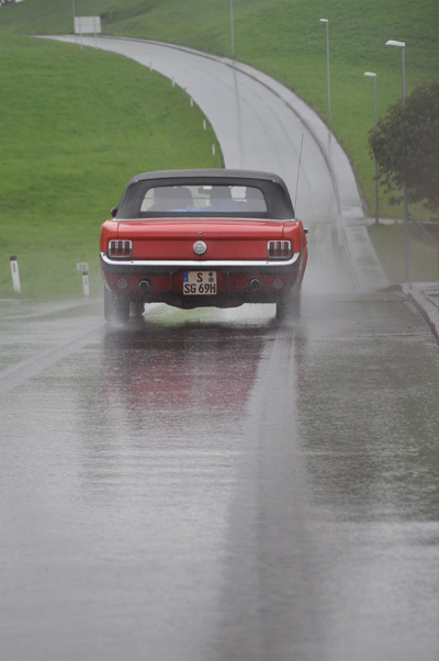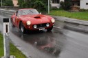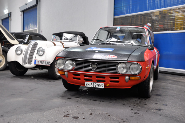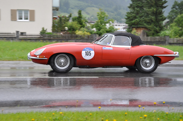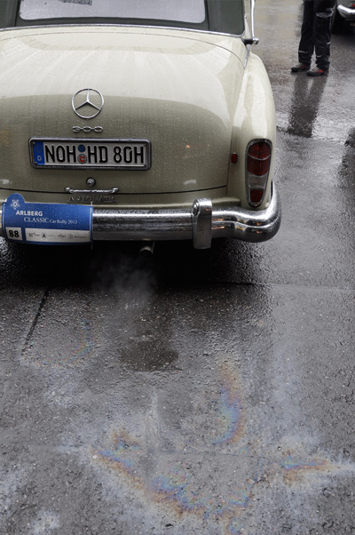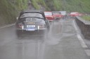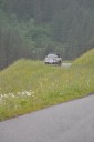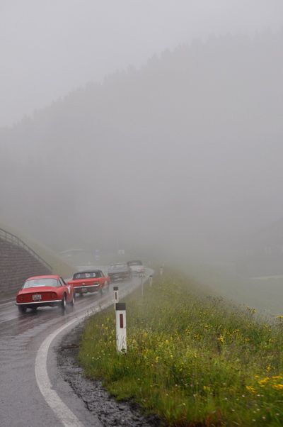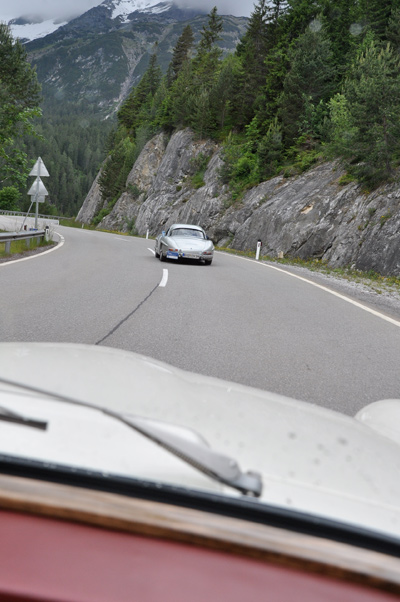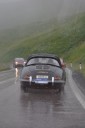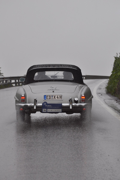 Es regnet und es ist ziemlich ungemütlich. Einige Teams kapitulieren wohl oder sind ausgefallen, denn unsere geplante Startzeit verschiebt sich um 20 Minuten nach vorne. Die Strecke geht zunächst Richtung Zürs, über den Flexenpass und die bereits 1897 spektakulär aus dem Fels gehauene Flexengalerie nach Stuben-Langen. Hier fand 1927 das erste Arlbergrennen statt, welches Hans Stuck auf Austro Daimler gewann. Am Abschlussabend wurden lustige Originalfilme gezeigt, die die Fahrer bei ihrer halsbrecherischen Fahrt über die damals noch ungeteerte Strasse zeigten. Nicht selten kam es zu spektakulären Abflügen und Überschlägen.