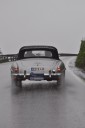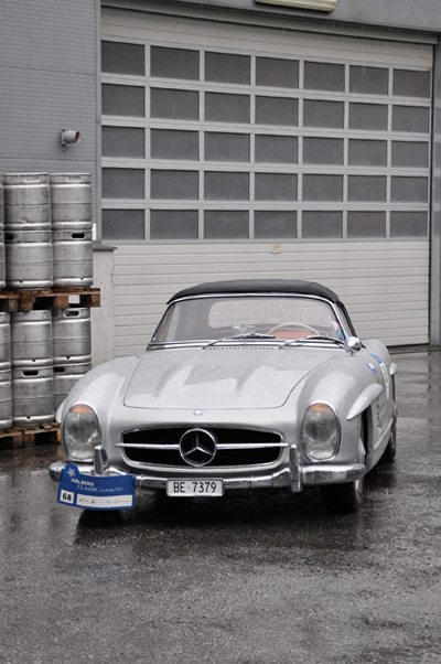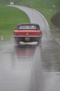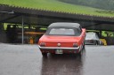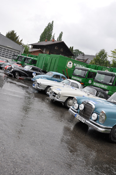 Die erste Prüfung ist gleich eine Doppelte. Zwei Start- und zwei Zielpunkte. Die Geschwindigkeitsschnitte ändern sich von langsam auf schnell. Wir kommen gut durch die erste Lichtschranke, aber zur zweiten schaffen wir es nicht in der vorgegebenen Zeit. Bei weitem nicht, obwohl wir alles rausholen. Die Strasse ist nass, die Kurven eng und uneinsehbar. Wegen der Witterung wird die Prüfung später annulliert werden. Glück gehabt! Die anderen WPs laufen gefühlt gut. Interessant war die „Rollprüfung“. Mit abgeschaltetem Motor (oder im Leerlauf) musste man eine steile Strasse runter rollen und die Doppelprüfung fahren. In BBBB müssen wir ein Paar Kühe auf der Bundesstrasse überholen, die auf eine andere Weide wollen. Die Route geht über Bludenz nach Dornbirn, wo uns die Mohrenbrauerei zum Mittagstisch empfängt. Die Bierfässer und Flaschenkisten im Lager und auf dem Hof bilden eine tolle Kulisse für unsere Oldtimer. Gut gestärkt mit Weißwurst, Gemüsestrudel und Schinkenspeck geht es in den Bregenzerwald, dann über Hitisau, Reutte, Egg, Au über den Hochtannbergpass zurück. Der Scheibenwischer läuft den ganzen Tag und im Ziel angekommen ist das Sonnenlandverdeck komplett durchweicht und auch im Fußraum wird es langsam feucht. Wir sind erschöpft aber glücklich, der Sekt im Ziel schmeckt!