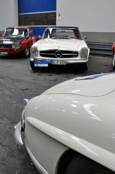 Etwas jünger dann ein VW Käfer, Jaguar XK 120 C-Type, E-Type, zwei Aston Martin DB2, Fiat Abarth 750 GT Zagato Coupe, mehrere Mercedes-Benz 300SL, Pagoden, ein 300S Cabrio, BMW 507 und 502, Facel Vega Typ FVS, Porsche 550, 356 und 911, Lancia Fulvia, Maserati 3500GT und Vignale Spyder, ein Enzmann 506 Rennspider oder einige bildschöne Ferrari: 250 SWB, 275 GTB, 250 GT/L Lusso 330 GT 2/2 oder ein 330 GTC Coupé! Mit in unserem Team die AMG „Rote Sau“, ein 300SL (W198), eine weitere Pagode (280SL), und ein 450SEL 6.9er von 1975 und der 190 SL eines Kunden.